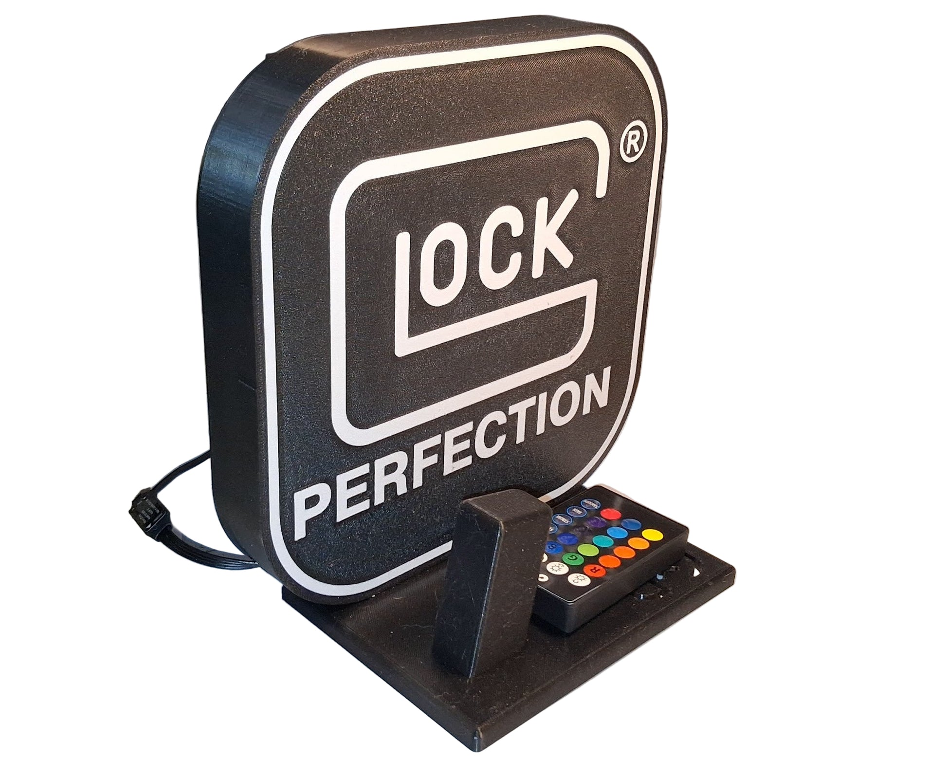 Elevate your space with the ultimate accessory for the enthusiast who demands "Perfection." This striking lightbox and display stand commands attention, serving as both a vibrant statement piece and a functional, secure rest for your personal firearm. Crafted from tough, resilient PETG plastic, it’s built to be more than just a showpiece; it’s durable enough for daily use, providing a dedicated and impressive home for your sidearm. Illuminate your passion with its dynamic, multicolor LED system. Use the included remote to cycle through a spectrum of colors, adjust brightness, or set captivating effects to perfectly match your room's mood or your collection's aesthetic. It's the perfect fusion of form and function, designed for those who recognize iconic performance. Please note that as we accommodate custom builds, the final size of your unique piece may vary slightly.
